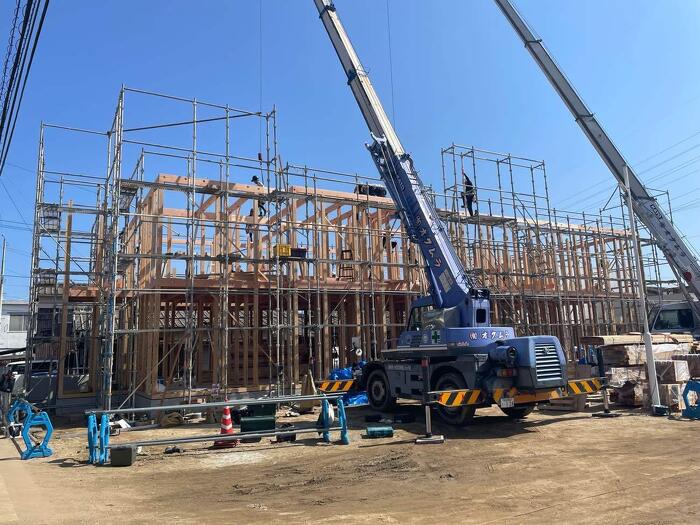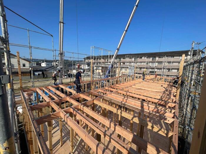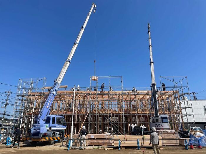 寄宿舎の新築工事順調に進んでいます! 先日、無事に棟上げが終わりました。 大きい建物だったのでレッカー車2台お願いしました。 40部屋の寄宿舎になります。 どんどん進めていきます!