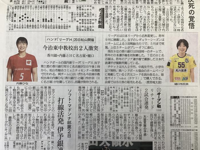 先日の愛媛新聞で、ハンドボールの国内新リーグ「リーグH」女子第21節の