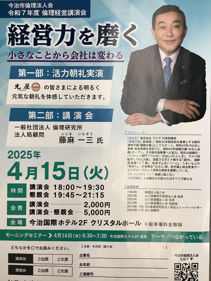 今治市倫理法人会令和7年度倫理経営講演会に社員16名で参加させて頂きました