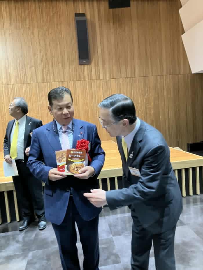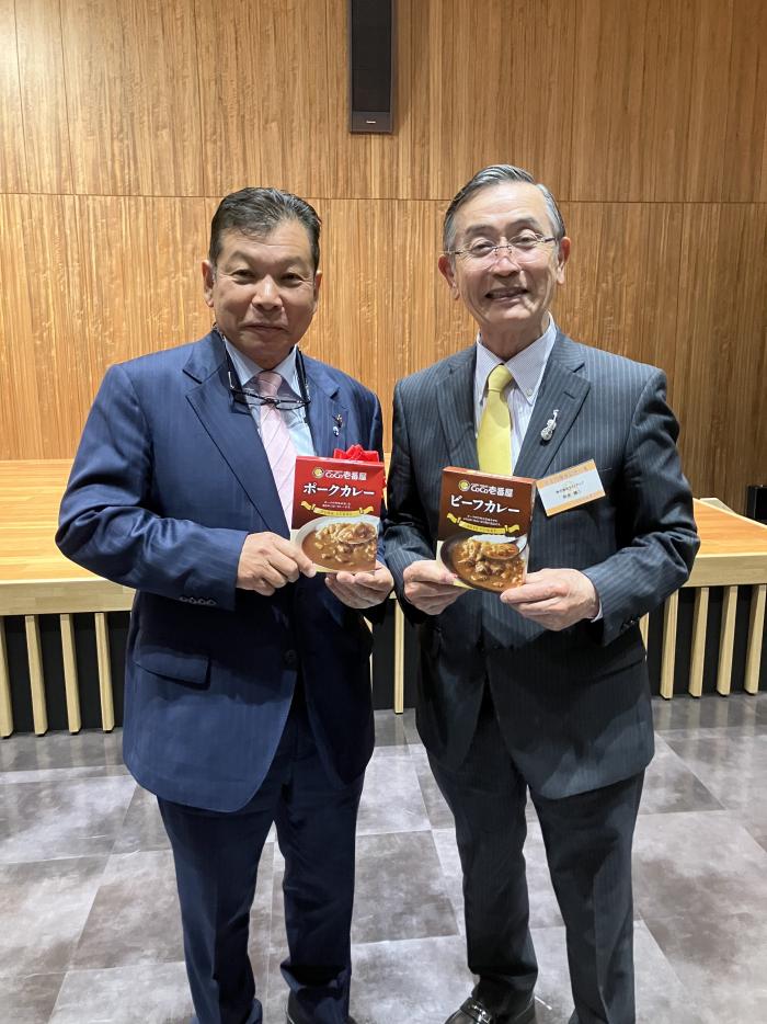 CoCo壱のカレーを持って記念写真を 宗次さんが逆だよと