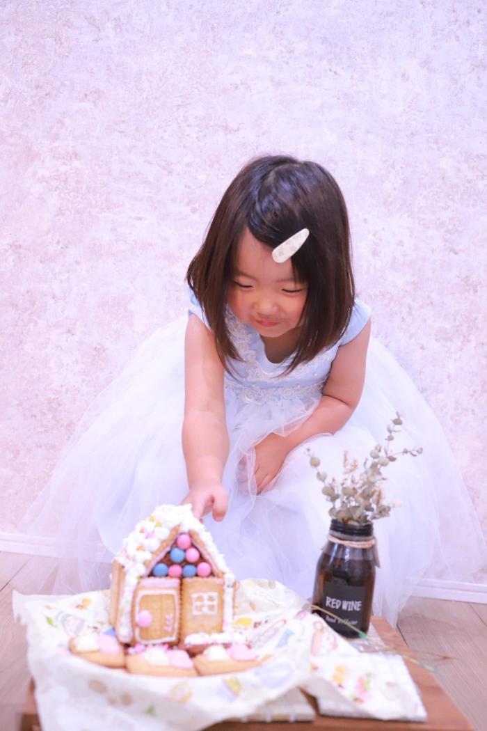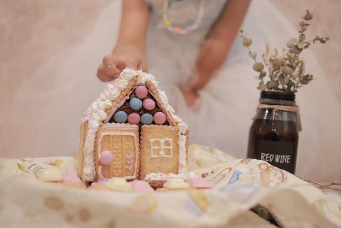 今年はお菓子の家を作ってみました! 隣でチョコをむさぼる4歳でしたが