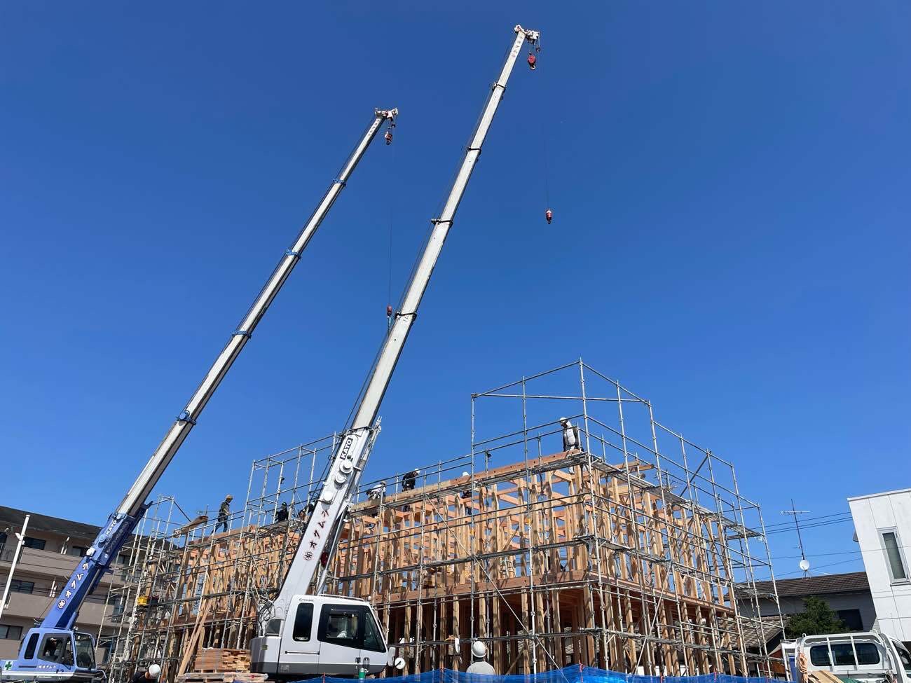 寄宿舎の新築工事順調に進んでいます! 先日、無事に棟上げが終わりました。 大きい建物だったのでレッカー車2台お願いしました。 40部屋の寄宿舎になります。 どんどん進めていきます!