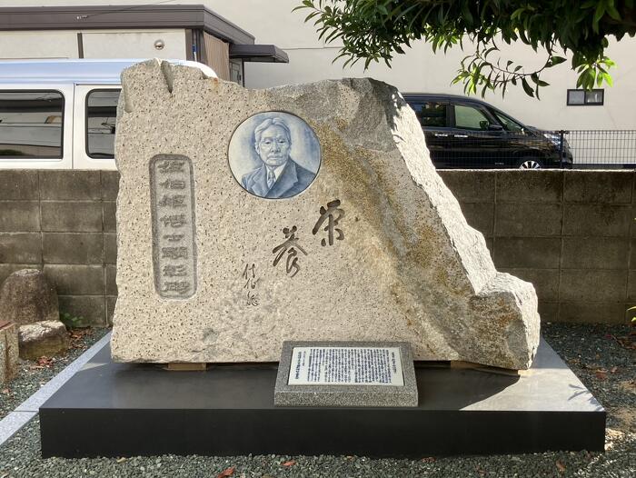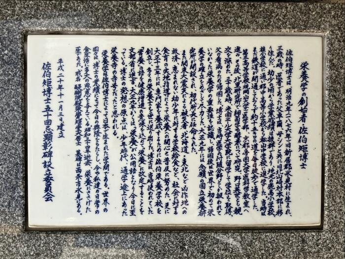 入り口に、佐伯の筆による「栄養」の書と、「佐伯ただす博士顕彰碑」が建立されてました