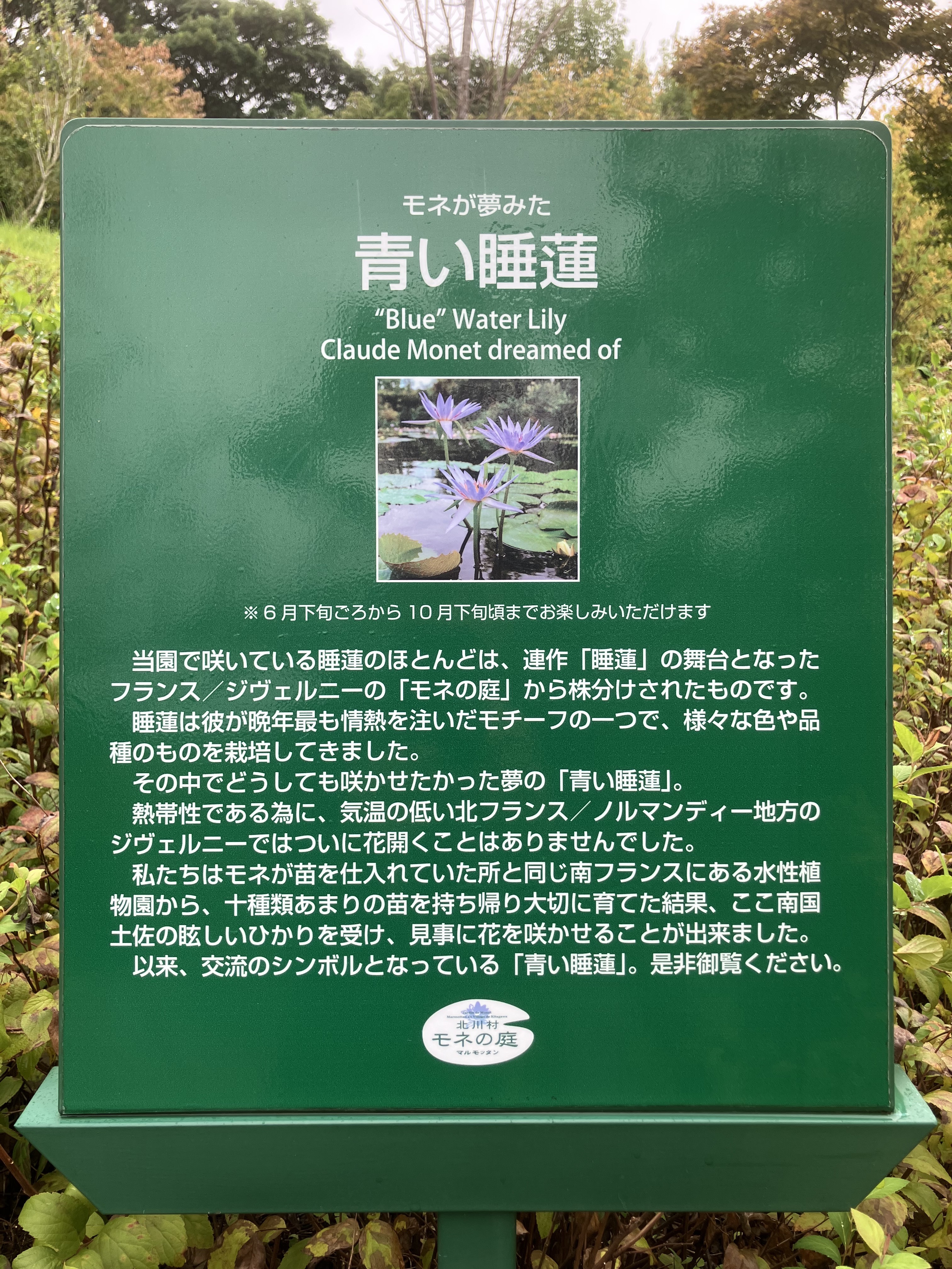 モネも水蓮を栽培されてて、北フランスでは咲かなくて、モネが咲かせたかった「青い水蓮」が