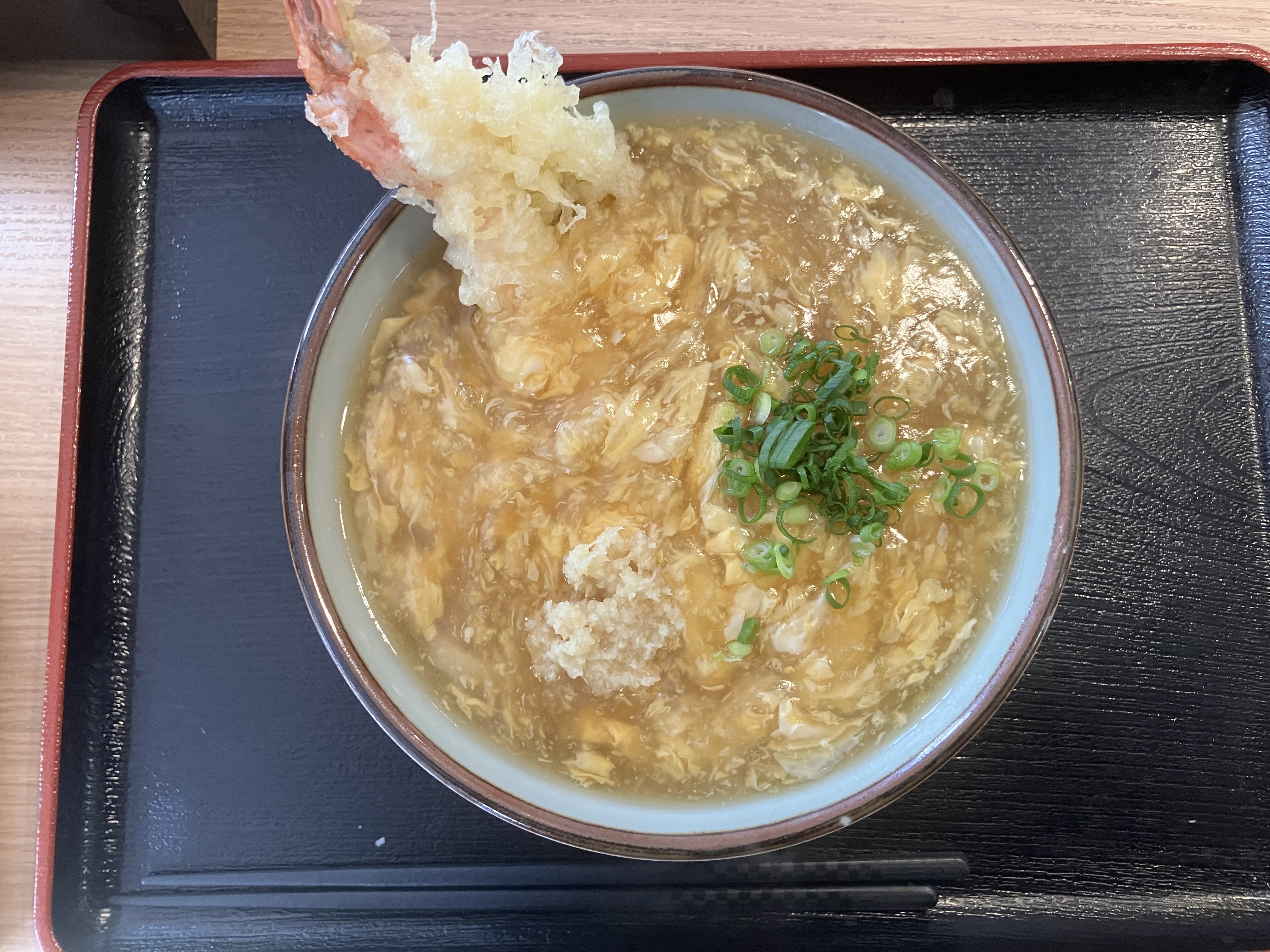 「けいらん海老天うどん」を食べました ふんわり溶き卵が絡んだとろみ飴と海老天 最後まで平らげました!