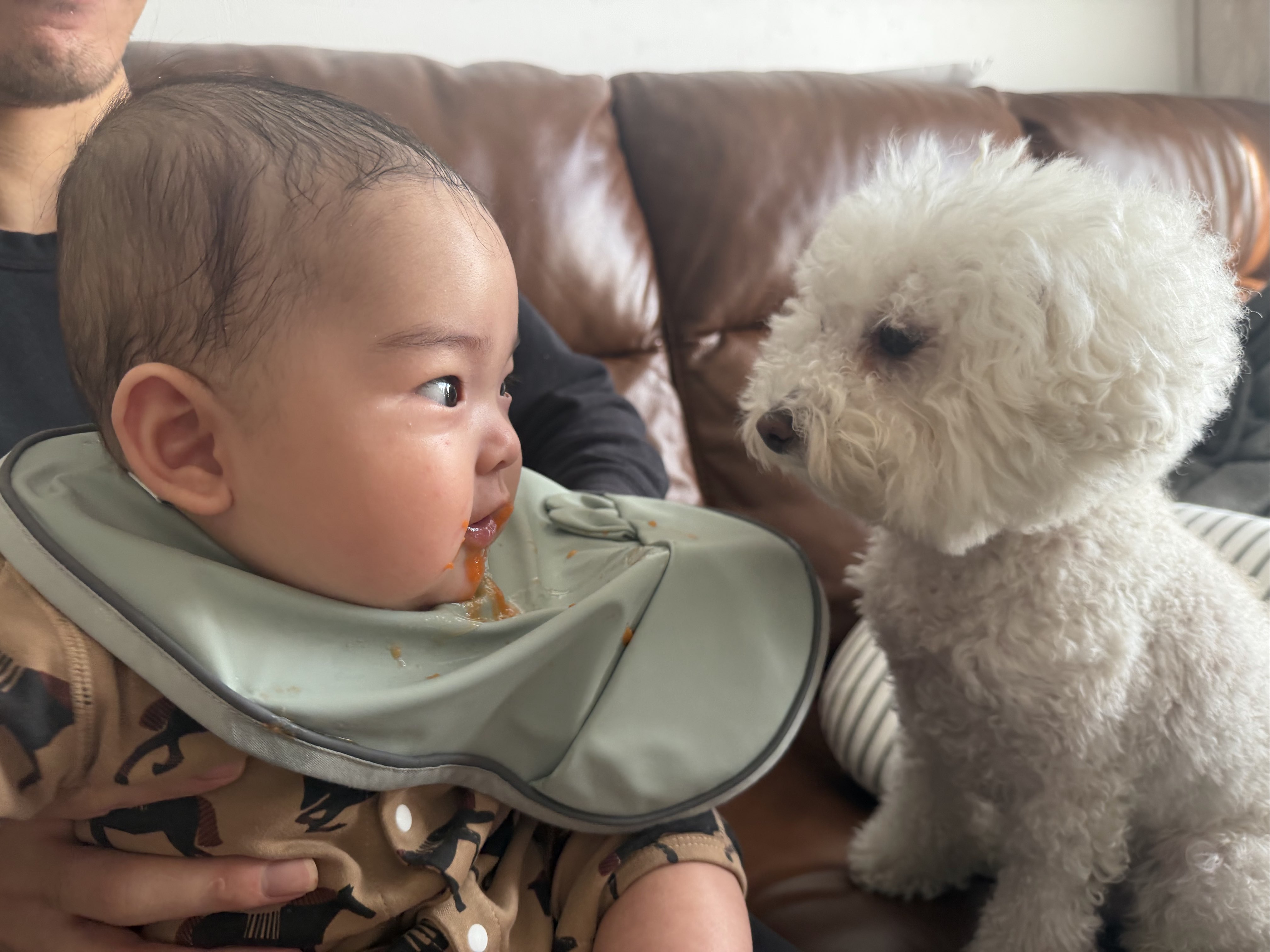 お陰様で、離乳食を食べるようになりました 離乳食に目を光らせてるゴン太・・・