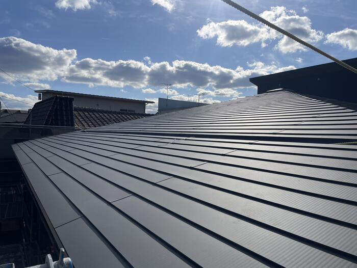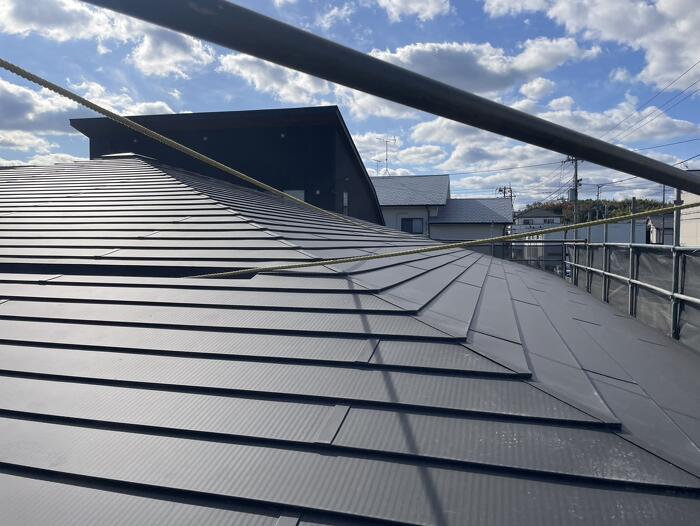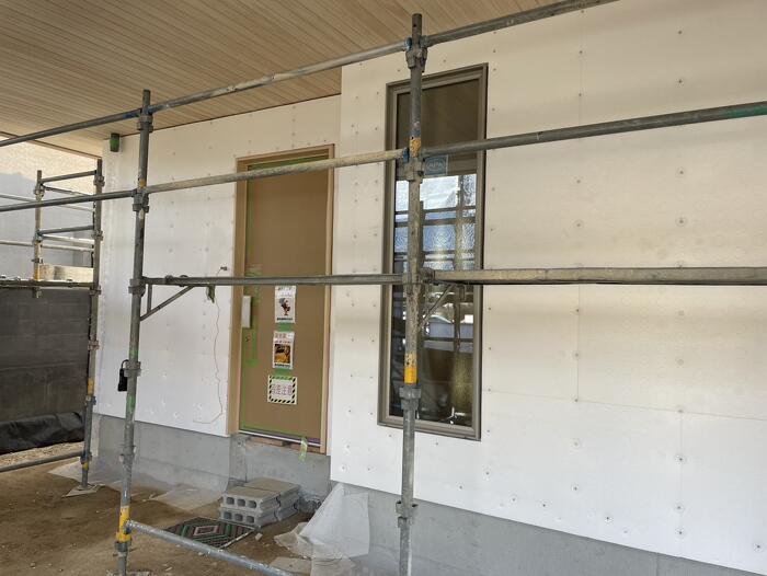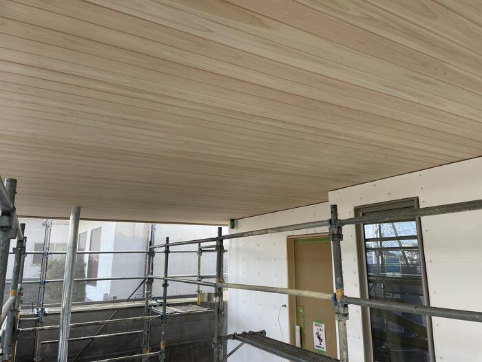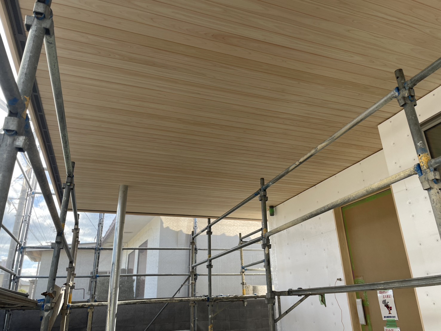 馬越で建築中のモデルハウスですが 外部の工事進んでおります! 軒天には檜を貼っています。 外壁は塗り壁下地のボードを貼って 年明けから左官塗りを進めていきます。