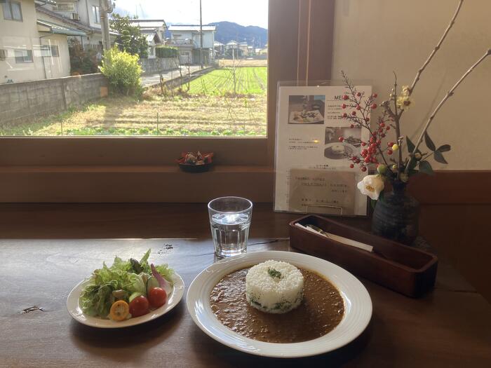 スパイスカレーを注文しました サラダは窓の外の畑で採れたもの!