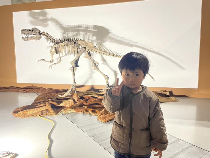 動く恐竜にビビッて 動かない骨と積極的に写真を撮っています笑