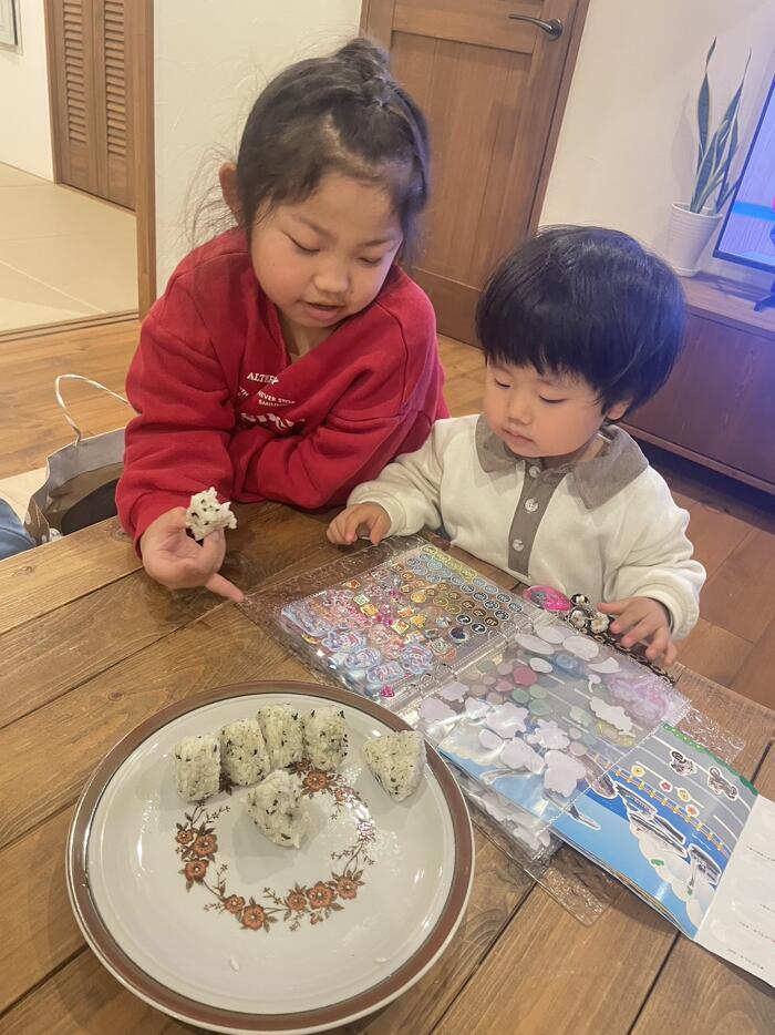 子供たちはというと おでんは子供たちからすると不人気メニューなので おにぎりを食べていますね おにぎりを食べながら はやりのシル活=シール活動 に勤しんでいました。 わたしもシール帳世代なので 見ているだけでワクワクします♡ 以上 ムカイヤマでした。