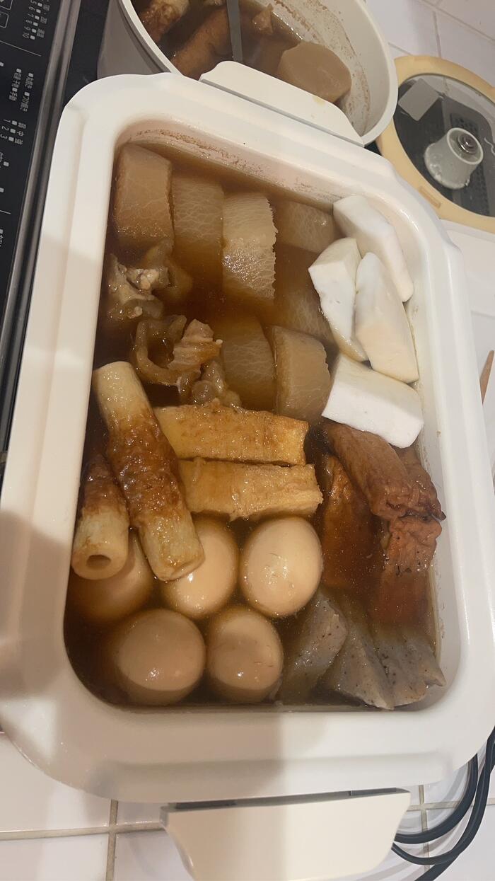 こんにちは むかいやまです。 先日、我が家でおでんパーティをしました! 毎年冬の恒例行事です。 前日から煮込み、次の日の夜食べるためにシミシミにします。 大根のシミシミ具合といったら・・・・ この茶色具合で伝わると思います。