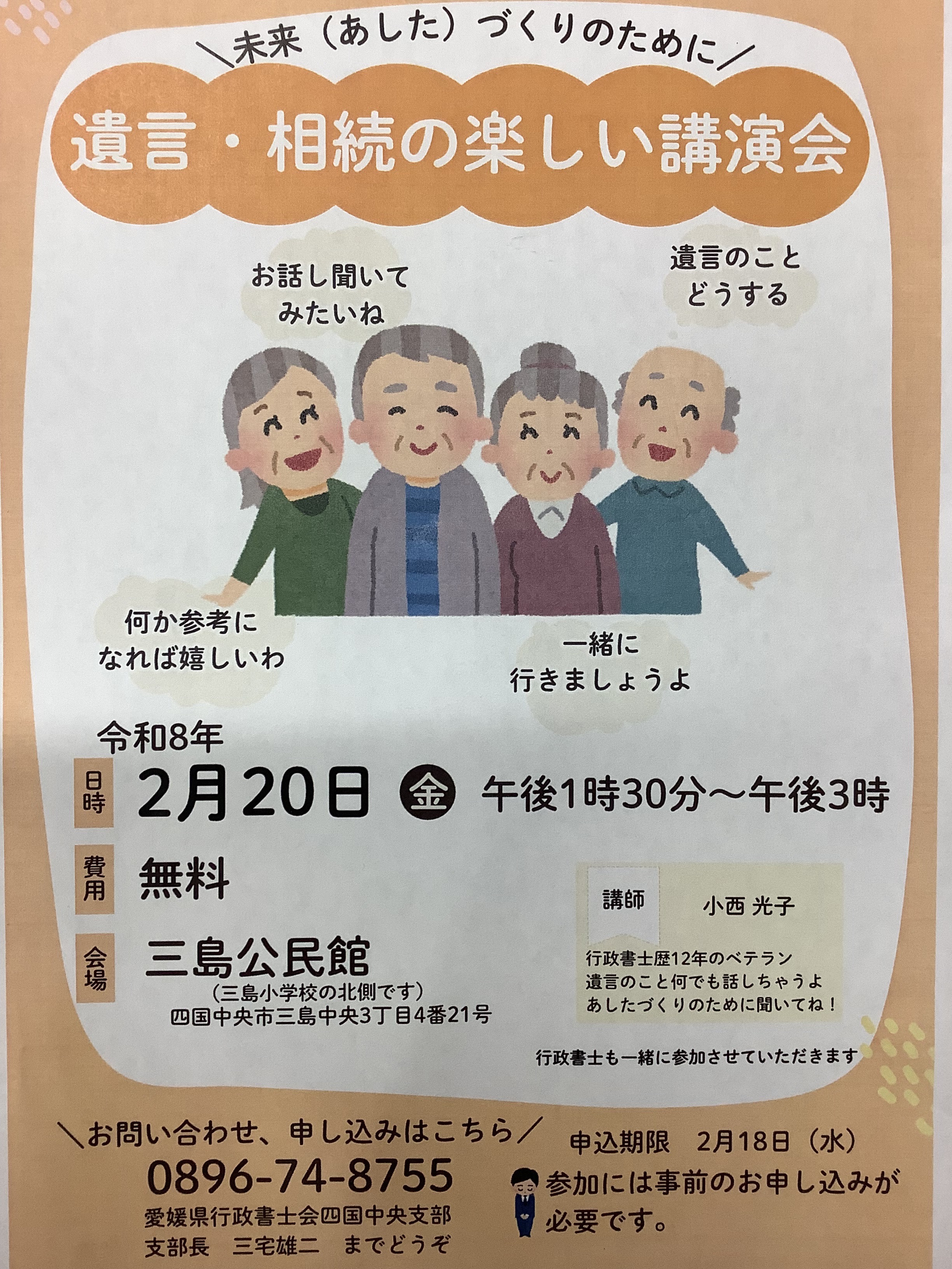本日は、四国中央市で、「遺言・相続の楽しい講演会」に参加しました!