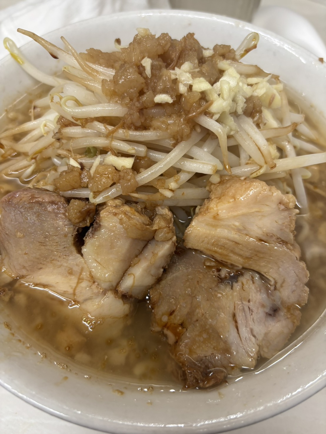 まずは、歴史を刻め 下新庄店で豚ラーメン。 山盛りもやしと分厚い豚の迫力がすごい! 豚は脂身多めでほろほろチャーシューでした。