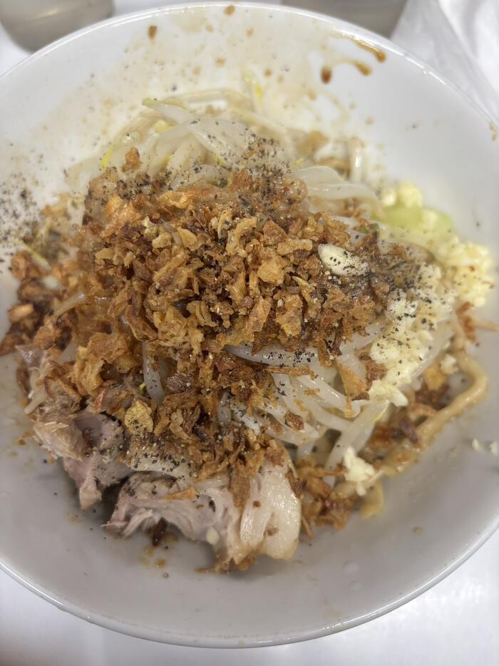 続いて、歴史を刻め 中百舌鳥店で汁なし。 次郎系は何度見てもビジュがいいですね(笑) フライドオニオンと黒コショウのパンチの効いた一杯。 同じ歴史を刻めでも個性があって、はしごして大正解でした◎ 次は2泊3日で挑戦してみたいです🔥