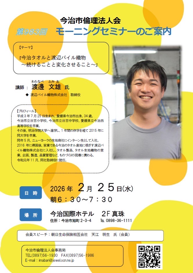 本日の今治市倫理法人会モーニングセミナーの講師は 渡辺パイル織物の渡邊文雄取締役さんでした!