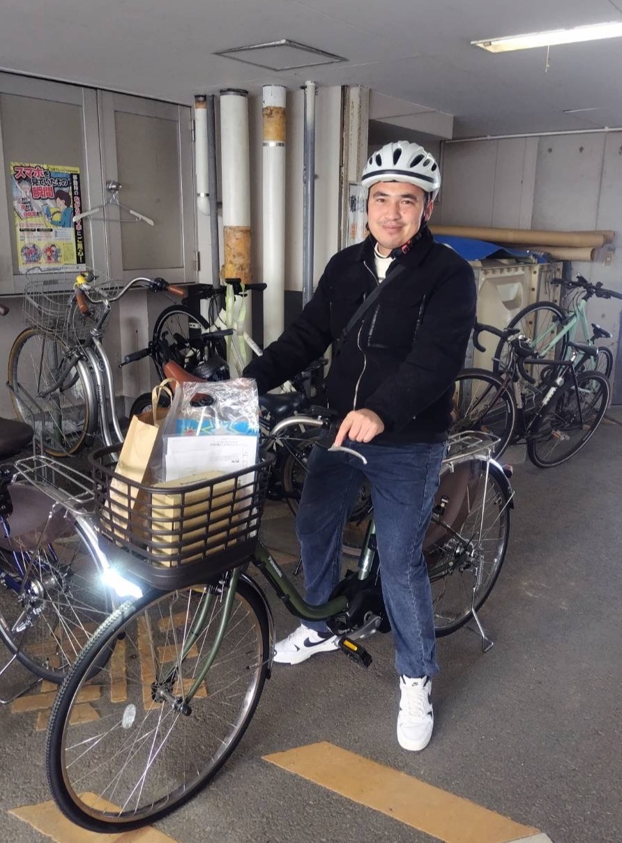 愛媛県の外国人材受入環境整備事業費補助金を活用して 購入した電動自転車をプレゼントしました! 明日より、大工として職場復帰です!